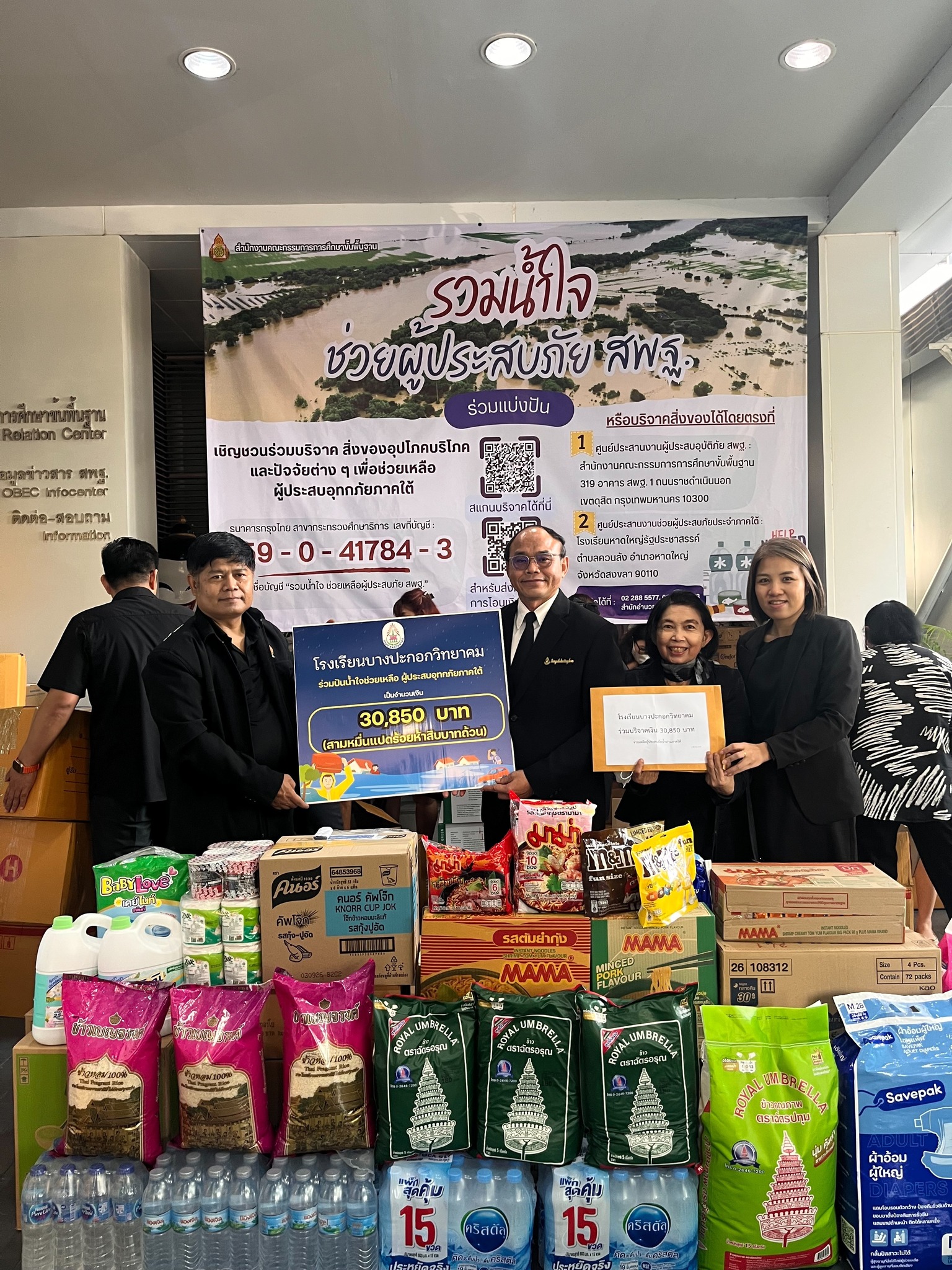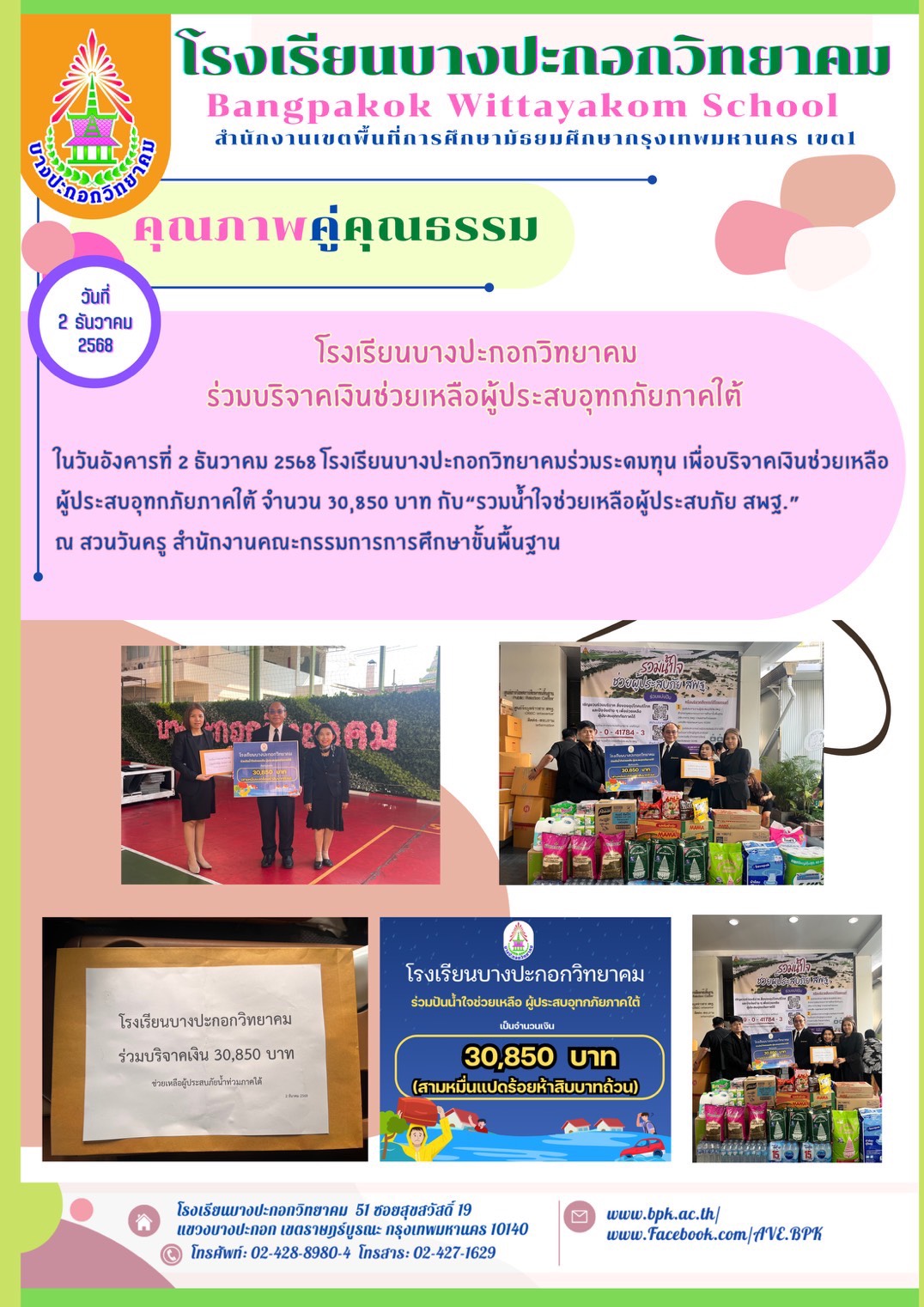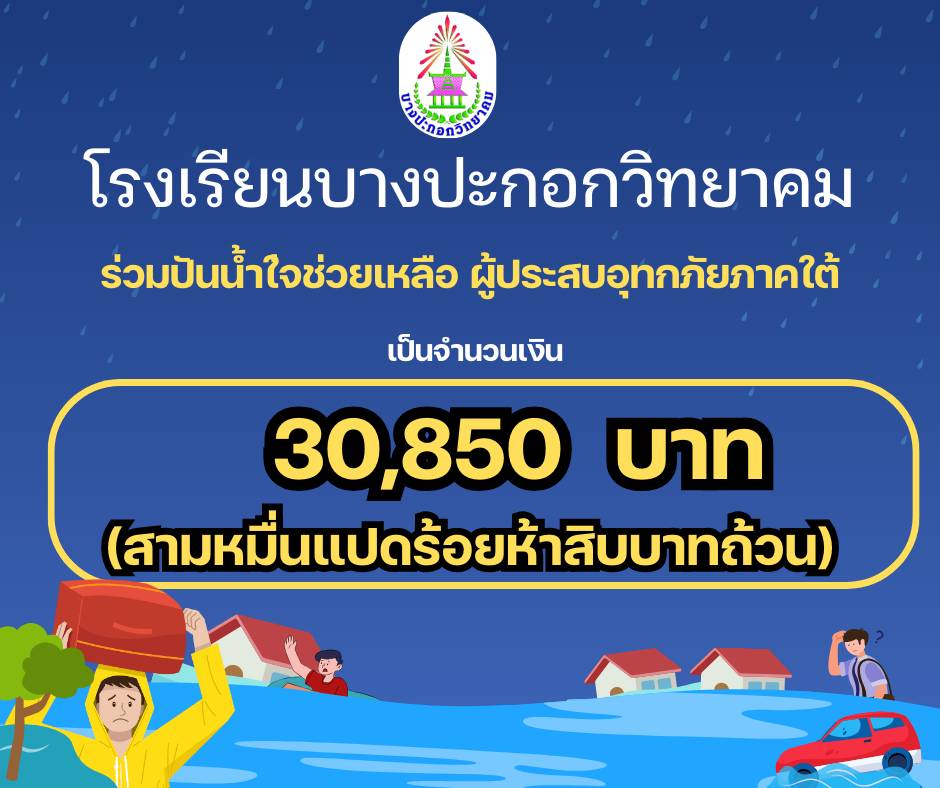โรงเรียนบางปะกอกวิทยาคมร่วมบริจาคเงินช่วยเหลือผู้ประสบอุทกภัยภาคใต้ “รวมน้ำใจช่วยเหลือผู้ประสบภัย สพฐ.” ในวันอังคารที่ 2 ธันวาคม 2568 โดยนายบุญชู กล้าแข็ง ผู้อำนวยการโรงเรียนบางปะกอกวิทยาคม คณะผู้บริหาร ครู บุคลากร นักเรียน และผู้ปกครอง โรงเรียนบางปะกอกวิทยาคม ร่วมบริจาคเป็น จำนวน 30,850 บาท ณ สวนวันครู สำนักงานคณะกรรมการการศึกษาขั้นพื้นฐาน