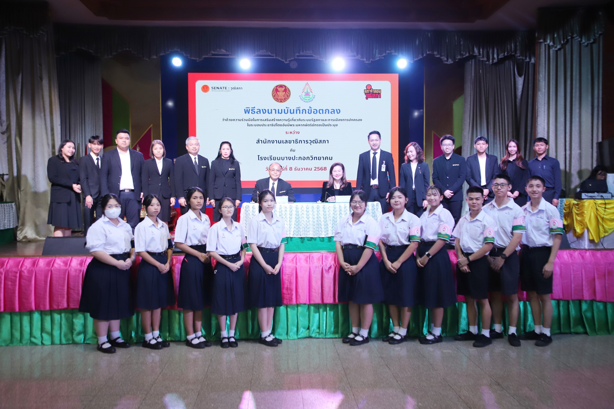 ร่วมกับสำนักเลขาธิการวุฒิสภา คณะผู้บริหาร ครู เเละคณะกรรมการนักเรียน ร่วมลงนามในพิธี ณ หอประชุมยูงทอง โรงเรียนบางปะกอกวิทยาคม เมื่อวันที่ 8 ธันวาคม 2568